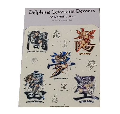 Edgy fairies- five of them, some a little punky, some a little Goth, some just offbeat- plus three small butterfly magnets. Use them on your car, your locker, your refrigerator, your metal-wherever that might be! Magnets range in size from 1″ x1″ to 2.25″ x4.95″ . Overall size 6.25″ x8.5″ Artist: Delphine Levesque Demers