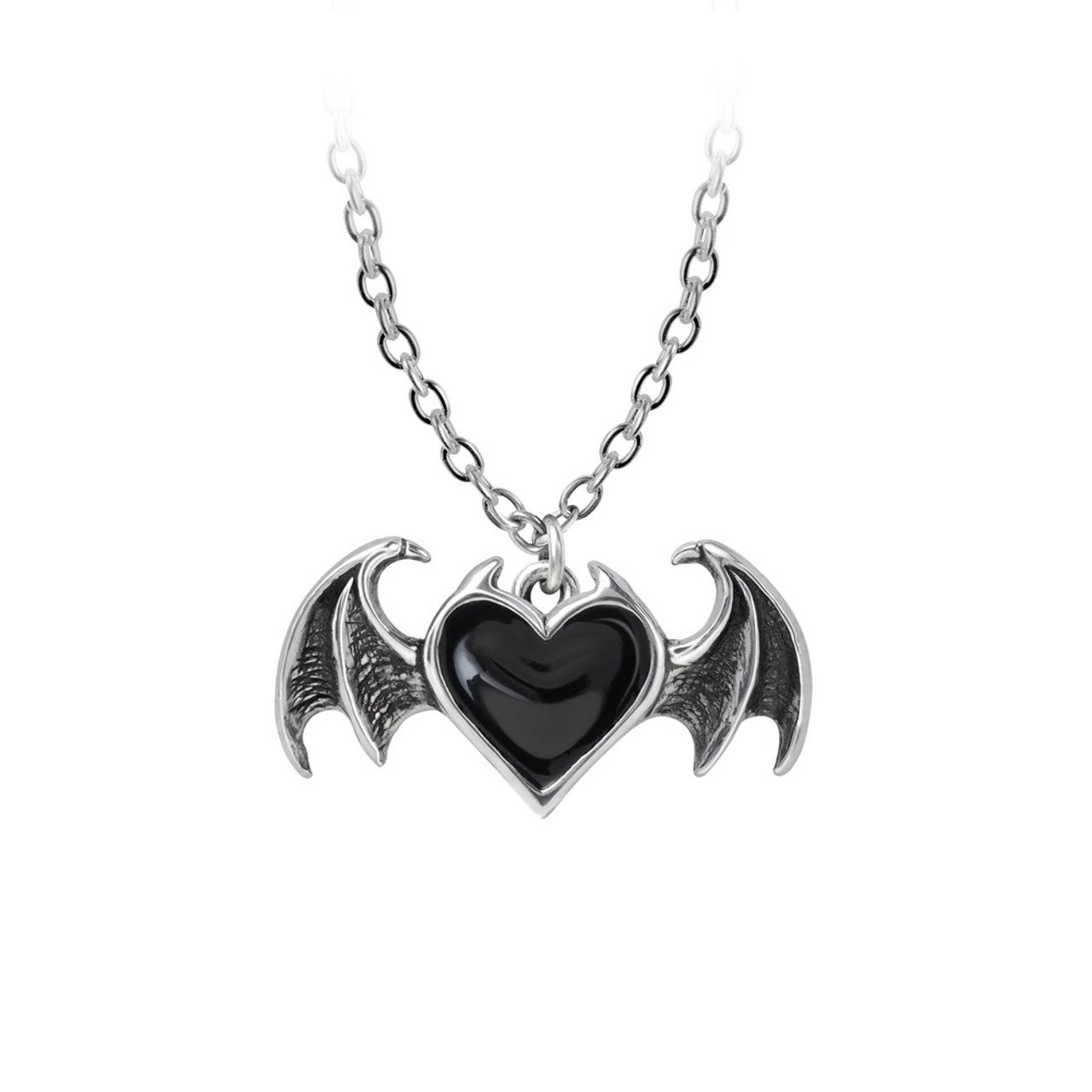 Antiqued pewter heart with black-enamelled fill and bat wings. On a 18″ chain.