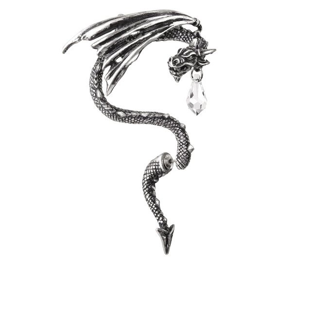 A highly animated pewter dragon faux-piecing wraps about the ear, clutching a suspended Austrian crystal dropper. For the right ear.