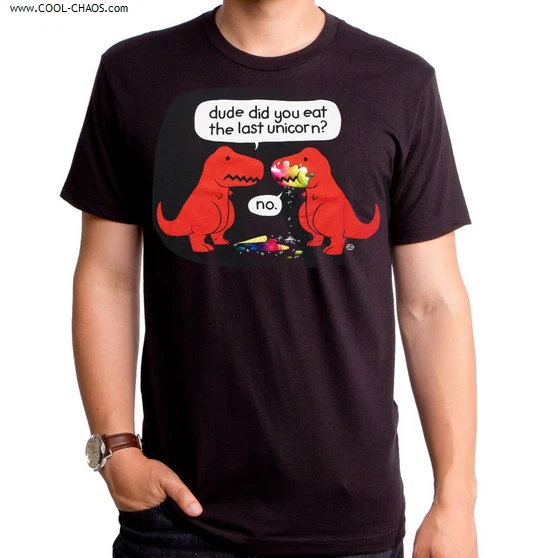 This funny dinosaur (and unicorn!) t-shirt has 2 T. Rexes, one asking “Dude, did you eat the last unicorn?” and the other replying, “No.” But he did. Because he’s Jerry, of course he did. He’s covered in prism foil which is what unicorns are filled with, apparently.
