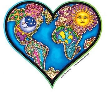 Earth Heart Planet Sticker-Inside the large heart is Artist, Dan Morris’ interpretation of Mother Earth. The continents are a patchwork of classic designs including sun, moon and stars, waves, leaves, clouds, flowers, mountains, and shadowy figures reaching sky high. Quality, vinyl 5 w x 4 1/2 h die cut art sticker. Artist:Dan Morris