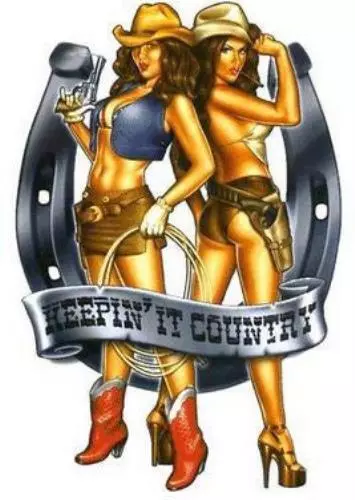 Flirty Cowgirls Sexy Pin Up Girl Sticker by Artist, Michael Landefeld. Keepin’ it country with this vinyl sticker of two sexy cowgirls. Both are loaded and standing in front of a horseshoe. ‘Keepin’ it Country’ measures approx.3.5 x 5.5 inches.