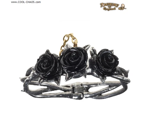 Three mysterious black roses, fixed to a thorny vine. Middle rose has a hidden magnet, and detaches when you want to remove the bracelet. Approximate Dimensions: S/M: Height 1.62″ x Width 2.25″ x Depth 0.50″ Materials: Fine English Pewter, Black Enamel