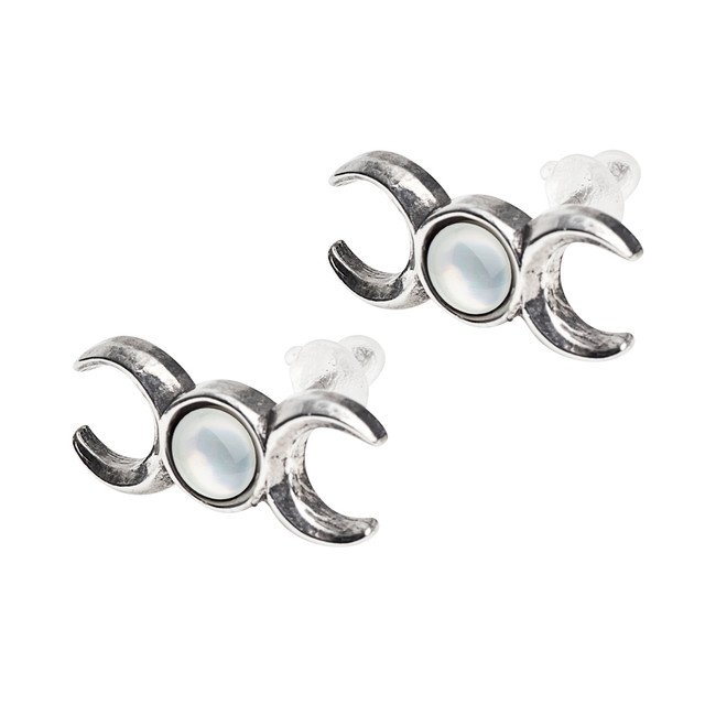 A small and discreet pair of pewter ear studs in the shape of the three phases of the moon, with a small mother of pearl cabochon as the central full moon . With surgical steel ear posts and plastic scrolls.