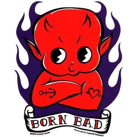 Rockin’ Sticker by Archaic Smile features a real Red Hettie Baby Devil’ with an anchor and heart tattoo, purple flames in the background and red wording at the bottom Text On Product:Born Bad Quality vinyl decal measures approx.3.5 x 4.5 inches