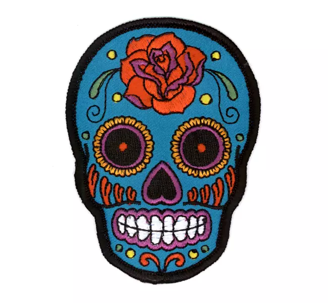 Sunny’s awesome sugar rose skull in a top quality, intricately stitched embroidered patch. Irons on securely to your jeans, jacket or bag–anywhere you want to rock some year round Day of the Dead style! 3″x3.5″ embroidered patch. Artist: Sunny Buick