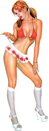 This Sexy Art Decal by Pin Up Artist, Carlos Cartagena features strawberry-blonde dancer wearing a tiny red bra top, red and white panties, long white stockings and high heels-She wears a Flirty Hibiscus Flower in her hair.